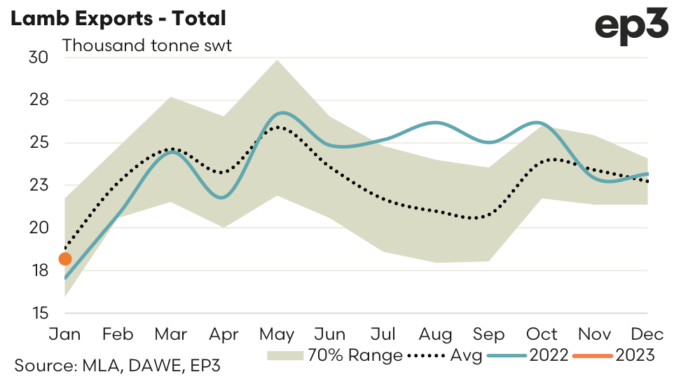 In terms of total lamb exports, the stronger opening from China and UAE has been offset by the below average start from the USA in a bit of a replication of the total mutton export flows. Total lamb exports for January 2023 was reported at 18,189 tonnes swt, nearly 7% above the January 2022 volumes and the strongest start to the season since 2020, but 3% softer than the five-year average for January.
