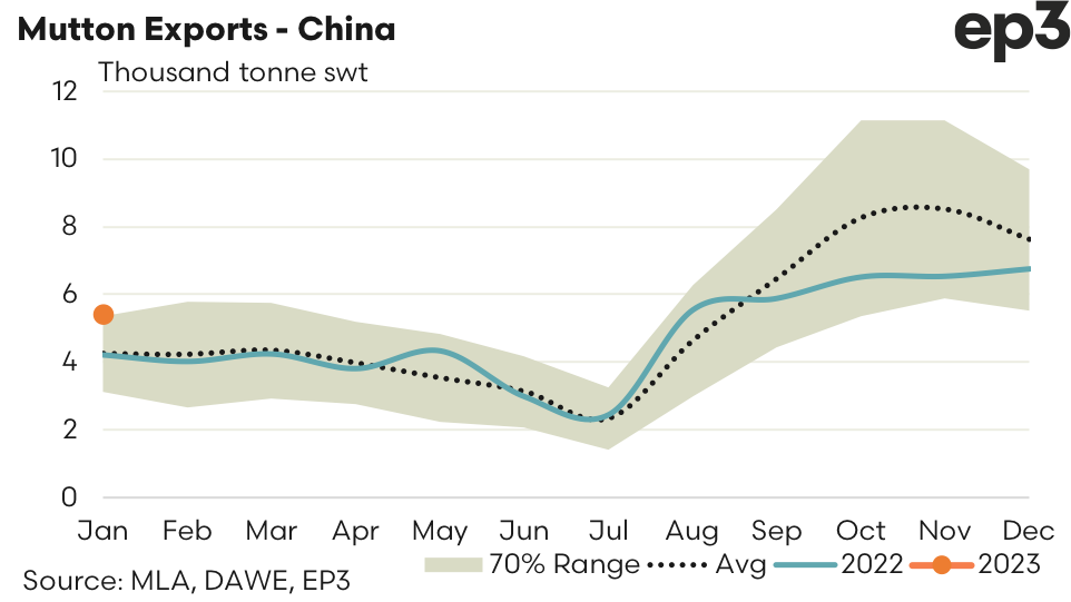 After a bit of a lacklustre end to 2022 China has opened 2023 with some solid demand for Aussie mutton. Export volumes came in at 5,412 tonnes swt for January 2023, which is now the highest Aussie mutton flows for January to China on record after beating the 4,805 tonnes set in 2019. Current mutton flows to China are sitting 27% above the five-year average for January.