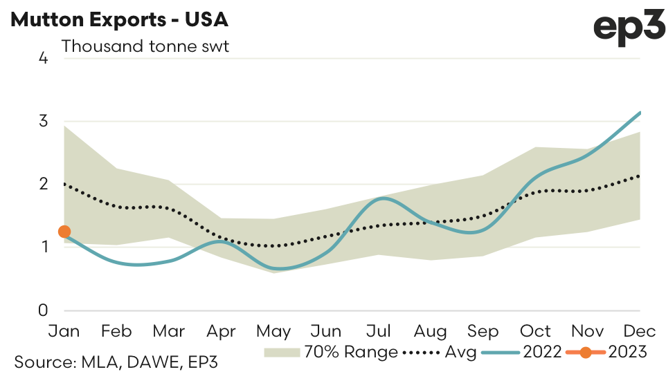 Meanwhile the USA has opened 2023 in similar fashion to 2022 with regard to their Aussie mutton demand reporting just 1,261 tonnes consigned. Compared to the five-year average for January mutton flows from Australia to the USA are running 37% under trend.