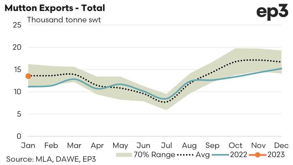 The strong start from China & Malaysia, combined with the below average US demand has placed total mutton exports from Australia during January 2023 at 13,532 tonnes swt. This is less than 1% below the five-year average pattern for January, representing the strongest start to the season since 2020 and is 20% higher than the mutton export volumes seen during January 2022.