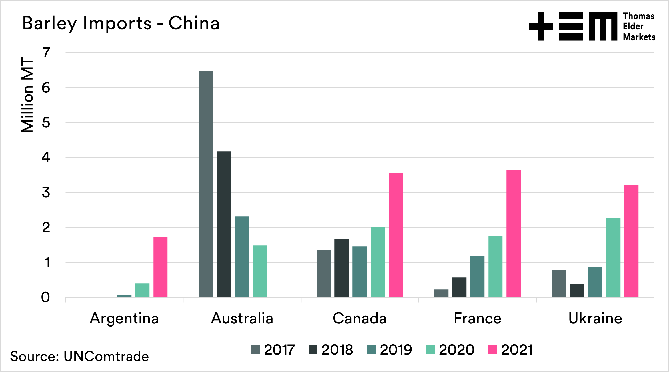 China did not stop purchasing barley; their purchases increased. Others quickly filled the void left by Australia. When a supplier comes out of the market, others will compete to win that business. All the significant barley exporters have benefitted from our ostracization, as seen in the chart below.