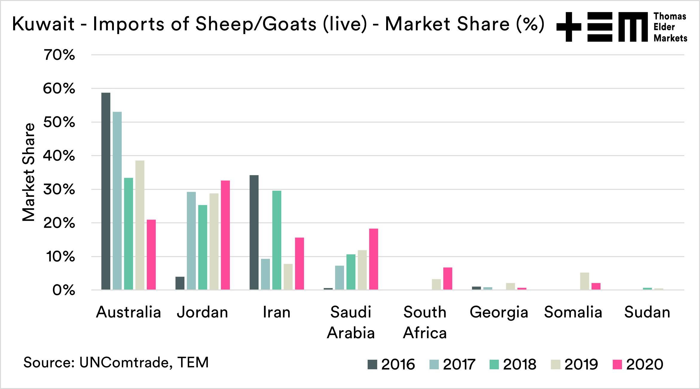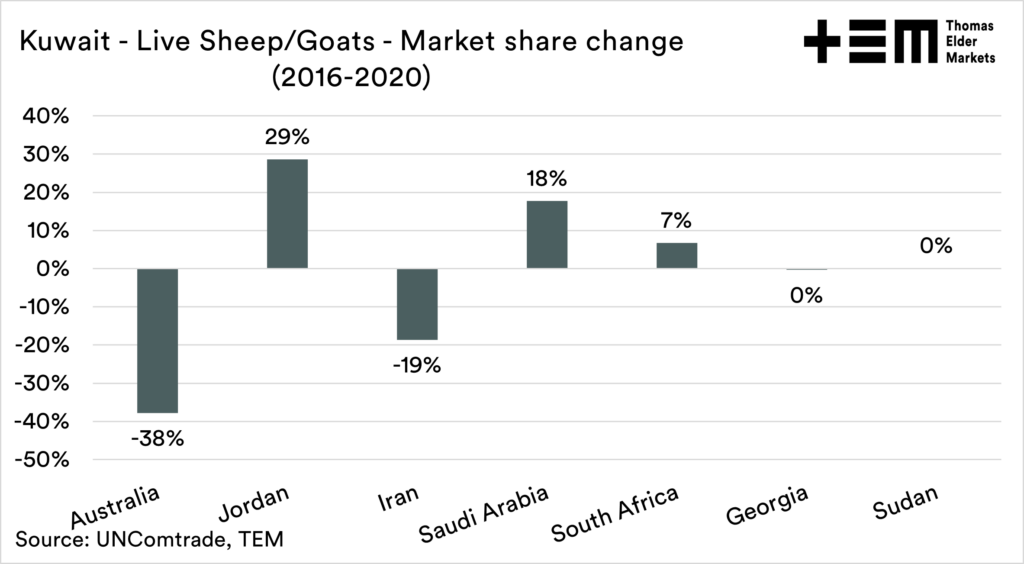 This can be seen more clearly in the second chart, which shows the market share of the major exporters to Kuwait. Australian market share has declined, and others have grown significantly.