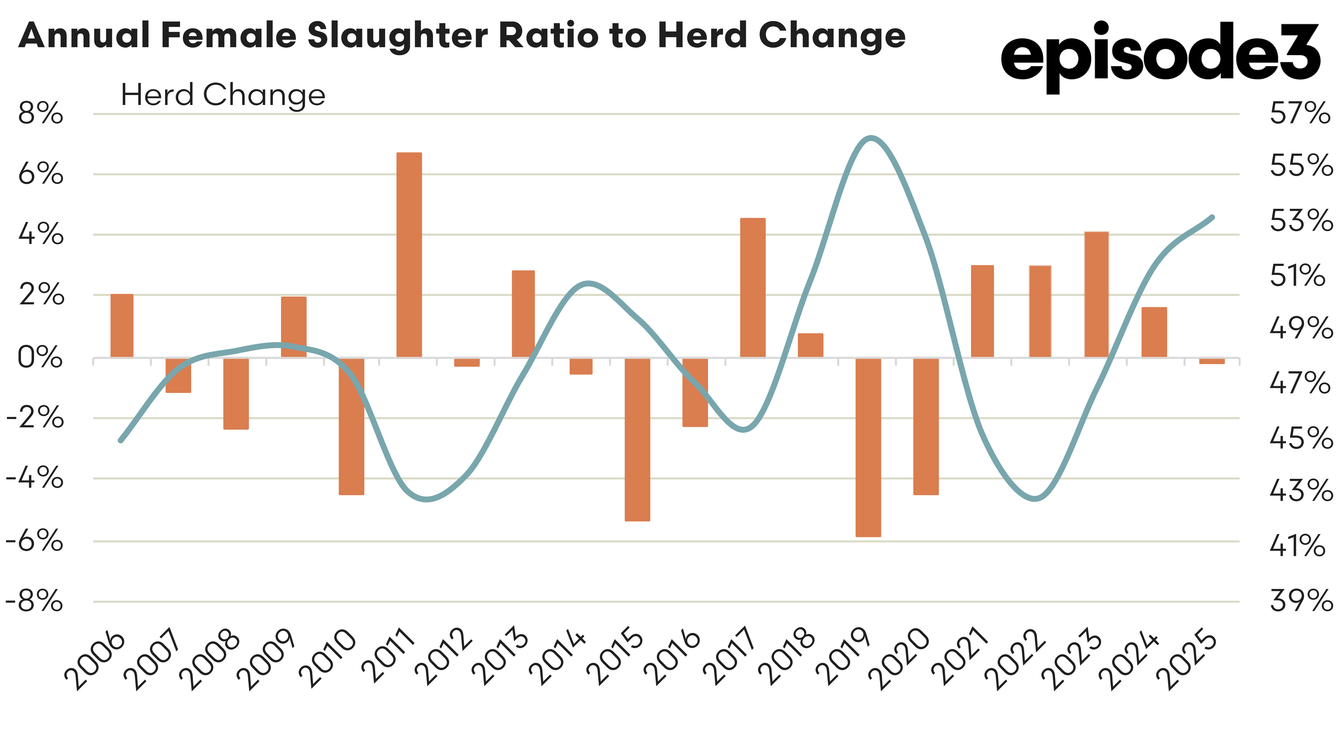 The longer term relationship between female slaughter and herd change, illustrated in the annual FSR versus herd change chart, helps explain why this matters. Periods of falling FSR typically precede improvements in herd growth rather than coincide with them. In other words, the data is signalling direction rather than confirming outcome. The herd is not rebuilding yet, but the conditions required for rebuilding are starting to form.