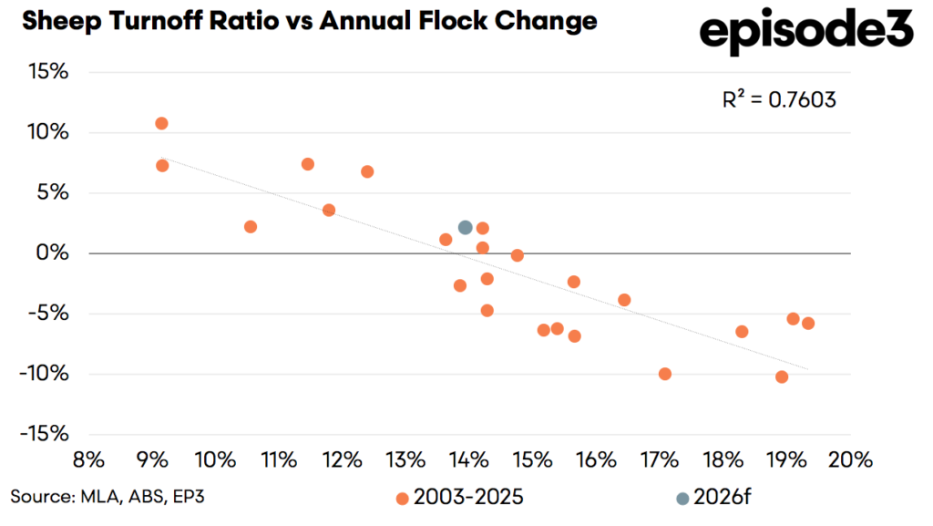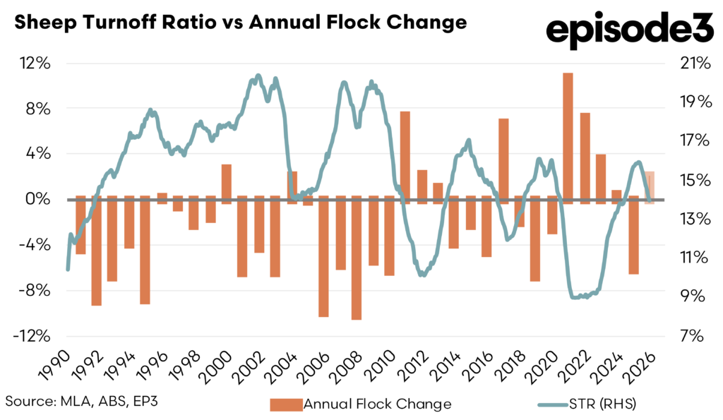 The sheep sector appears slightly further advanced along the cycle. The Sheep Turnoff Ratio declined to 13.9 percent heading into the end of 2025 and start of 2026. As shown in the turnoff ratio charts, lower STR levels are strongly associated with stabilisation or growth in the national flock. The historical relationship between STR and annual flock change demonstrates that once turnoff falls toward this range, flock contraction typically slows and eventually reverses.