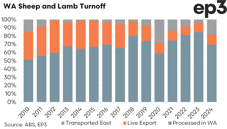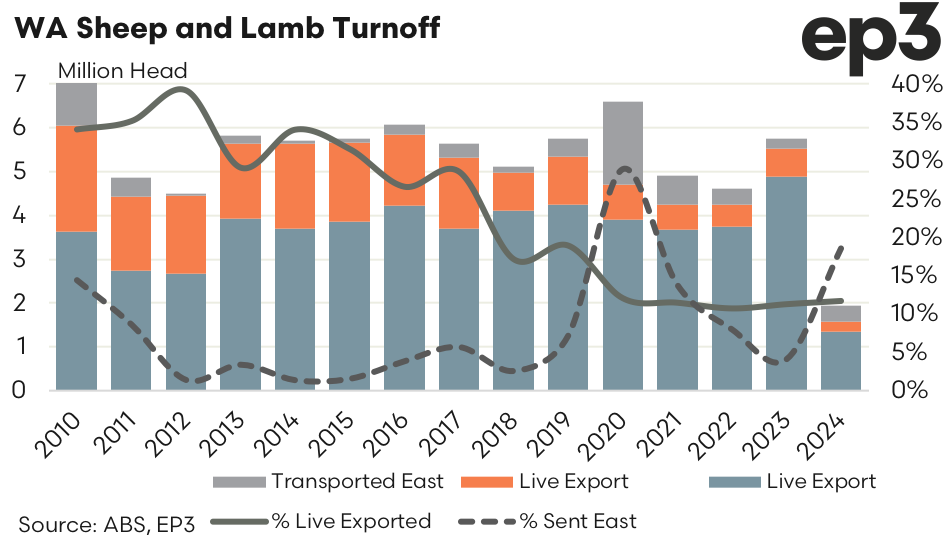 Updated data for Q1 2024 on WA slaughter, live export flows and transport east shows that the option for eastern transport has increased significantly this year. Turn off of WA sheep by trucking them east has lifted from 4.0% in 2023 to 18.5% so far this year. Meanwhile, the proportion of WA turnoff into the live export avenue has increased from 11.3% in 2023 to 11.7% in 2024. In contrast, the proportion of WA sheep being turned off into domestic processing within WA has dropped from 85% last year to 70% this year.