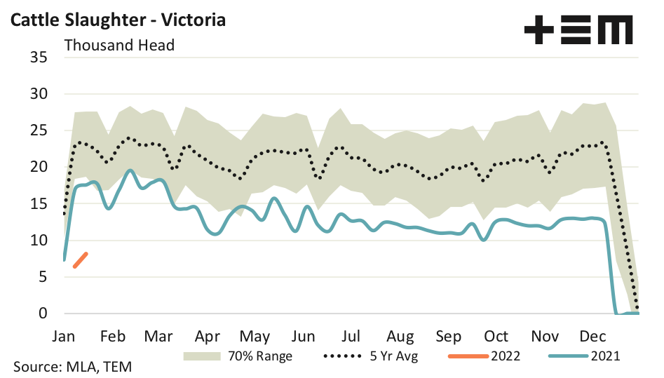 - Victorian abattoirs reported just 8,091 head of cattle slaughtered last week which is 54% below the levels seen in 2021 and a whopping 65% under the five-year average pattern for this week in the year.