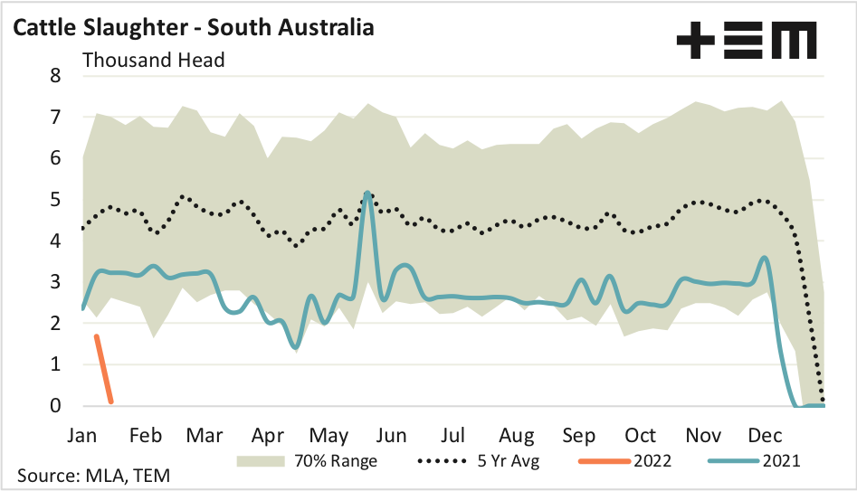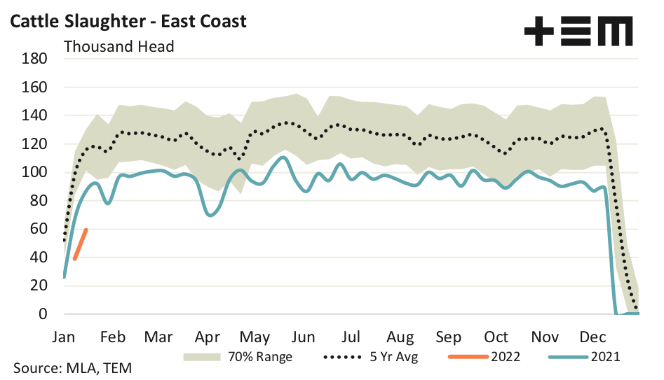 A breakdown of the mainland east coast states shows that Queensland reported 26,172 head of cattle processed for the week ending 14th January. This is 34% under the levels seen in same week in 2021 and 49% below the five-year seasonal average pattern. NSW cattle slaughter isn’t far off the pace set last year with processing volumes 10% under the 2021 levels at 20,422 head. However, a comparison to the five-year average shows NSW cattle slaughter remains nearly 37% under the normal seasonal trend for this week in the year.