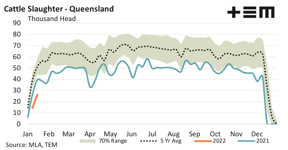 - Queensland reported slaughter levelsĀ 34% under the 2021 trend and 49% below their five-year seasonal average pattern.
