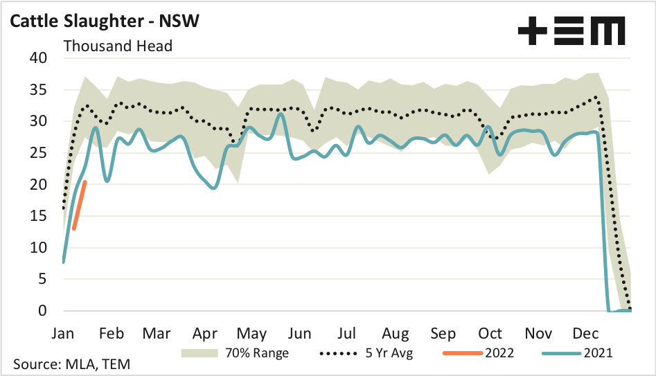 - NSW cattle slaughter isn’t far off the pace set last year with processing volumes 10% under the 2021 levels. However, a comparison to the five-year average shows NSW cattle slaughter remains nearly 37% under.
