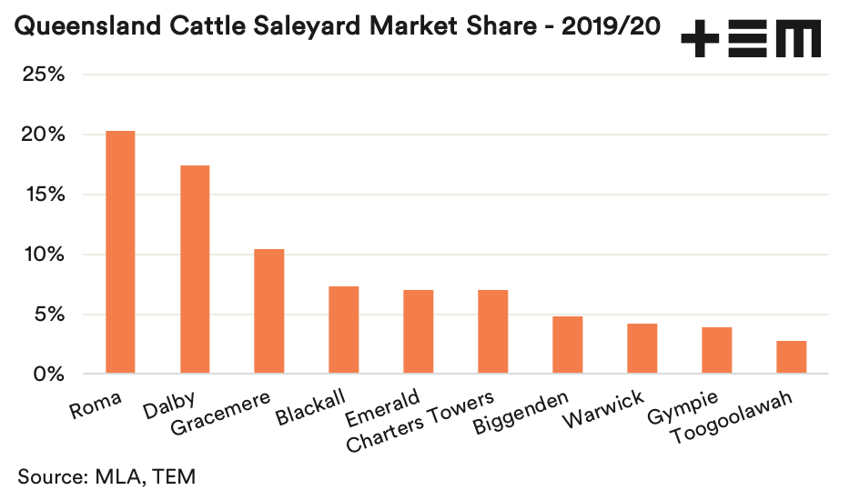 - The Roma saleyard in Queensland saw a 13.7% decline in throughput this season, yet remained the states top cattle sale yard for yarding volumes with a market share of 20.3%.
