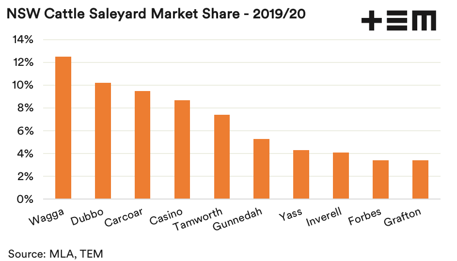 - The Dubbo saleyard in NSW posted a 19.6% decline in cattle volumes, losing top spot to Wagga Wagga. Dubbo saleyard registered 10.2% of the states cattle sales in 2019/20 compared to 12.5% in Wagga Wagga.