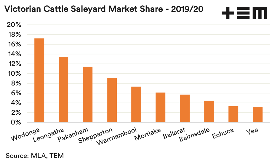 - The Victorian sale yard at Wodonga maintained their number one spot with a 4.3% growth in volumes over the season to capture 17.2% of the states cattle throughput.