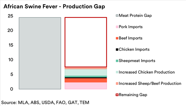 The protein gap caused by the loss is approximately 25 million tonnes during 2020. To fill the pigs’ gap, they had to import proteins of various kinds in increasing volumes from sheepmeat to Chicken. However, the reality is that there is only a finite volume of meat available for export worldwide and a gap of 17 million tonnes.