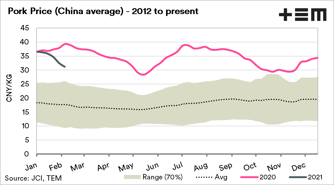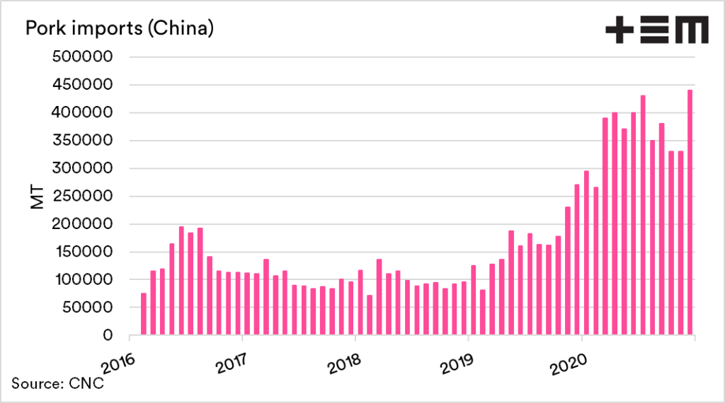 What goes up, must come down. Demand from China has caused a substantial increase in pricing levels due to a lack of local supply. Therefore, the Chinese swine herd is vital to Australia producers, as when it corrects demand for imported protein will drop.