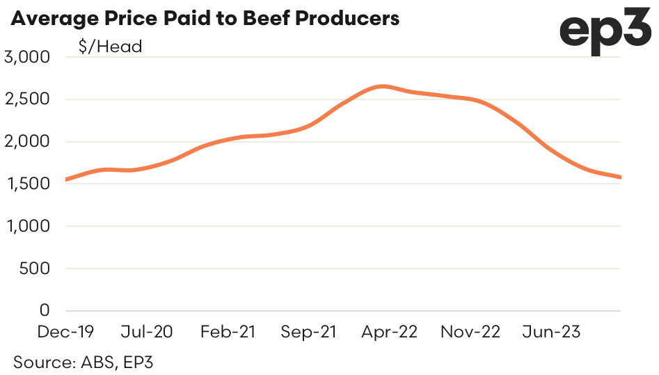 Data released from the Australian Bureau of Statistics this week included the quarterly dollar value of livestock slaughtered. Accessing the data for the volume of slaughtered animal types, in numbers of head, over the same time period we can generate some average per head prices for several livestock categories for each quarter since late 2019.