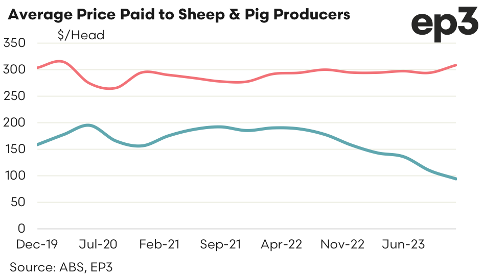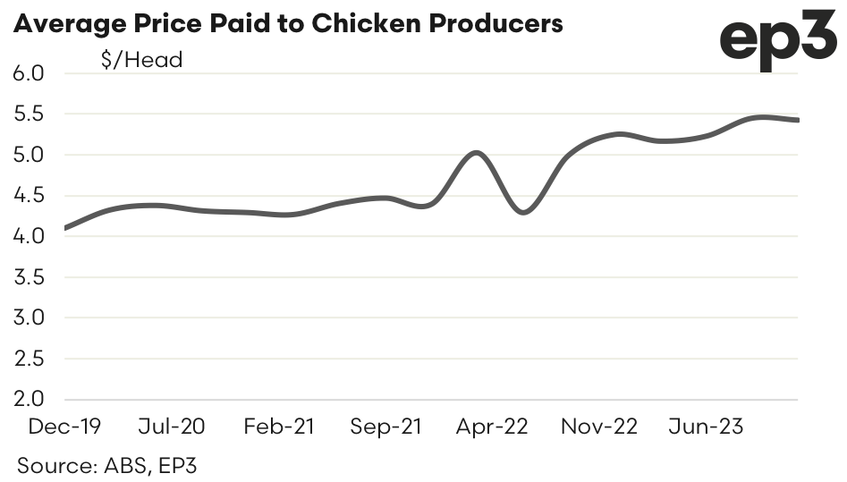 Average quarterly cattle prices have climbed from $1,500 per head in 2019 to peak at $2,600 before returning to $1,500 at the end of 2023. Average sheep & lamb prices have fluctuated between $150 t0 $200 per head for much of the 2019 to 2022 period, easing toward $100 per head by the end of 2023. Average pig prices have varied between $265 to $315 per head over the five years, with very consistent pricing of around $300 for the last 3 – 4 years. Meanwhile average chicken prices have shown relatively steady increases from $4 in 2019 to $5.50 per head in recent times.