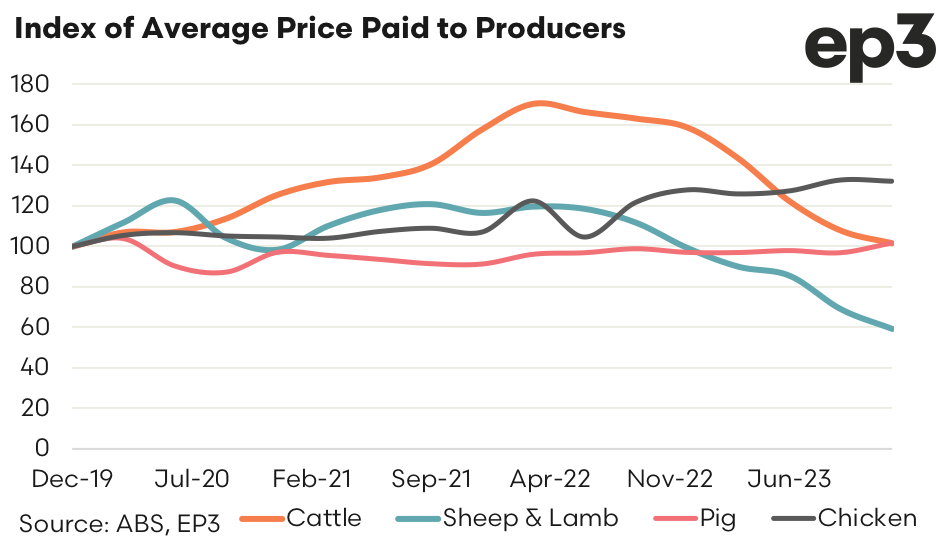 The chicken index has been the best performer across the entire five year period gaining steadily from 100 at the end of 2019 to sit at 132 as at the end of 2023. The cattle index outperformed the chicken index for much of the five year cycle, but recent price declines in cattle prices throughout 2023 saw chickens wrestle the winners trophy away from cattle in the last half of 2023.