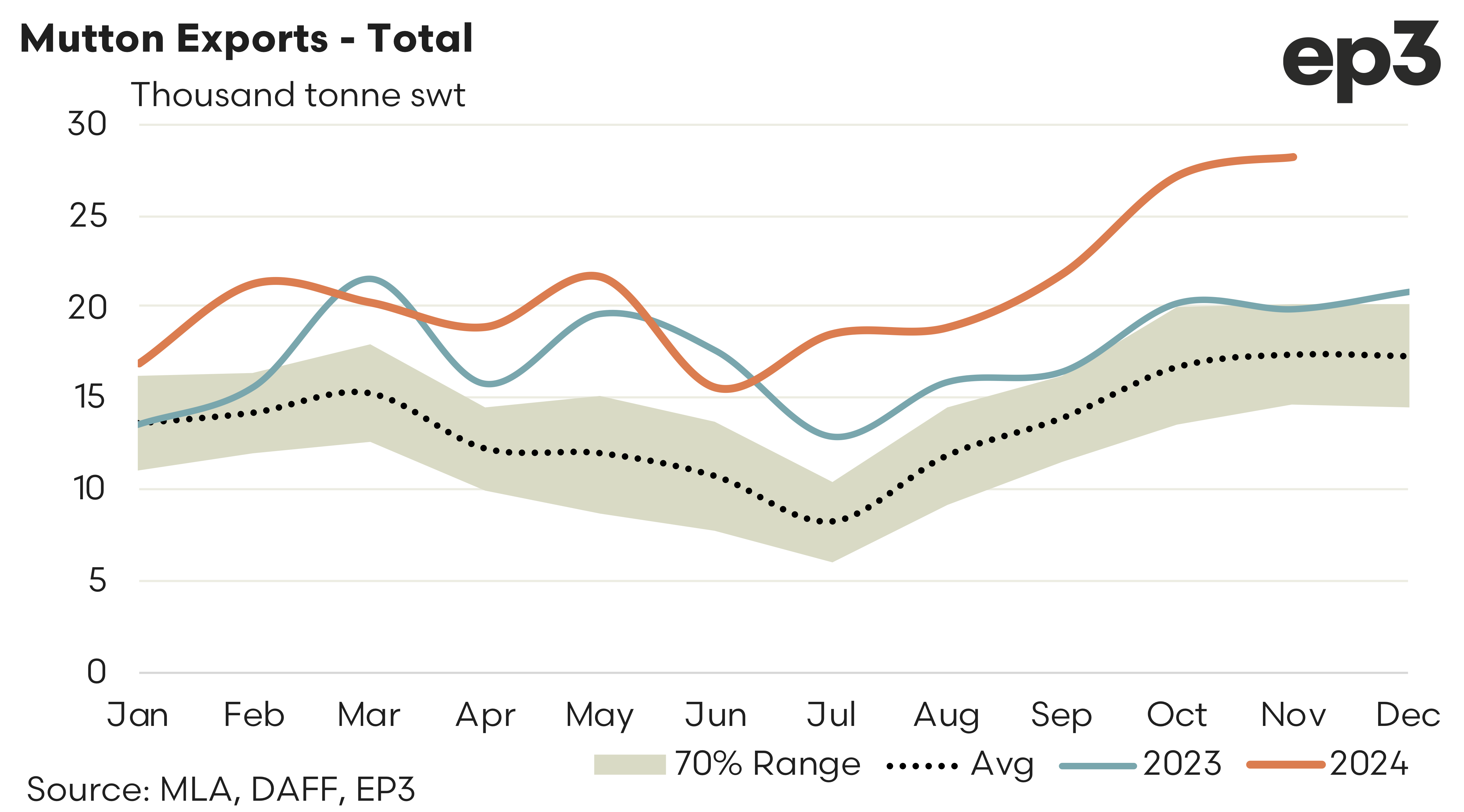 October 2024 saw the second highest monthly mutton export flows on record and November 2024 has managed to break the old record to set a new historic high for trade volumes. There was 28,249 tonnes of Aussie mutton exported over November, a 4% increase on the October volumes. Compared to the November five-year average volumes the current seasons mutton export levels are running 62% above the seasonal average levels.