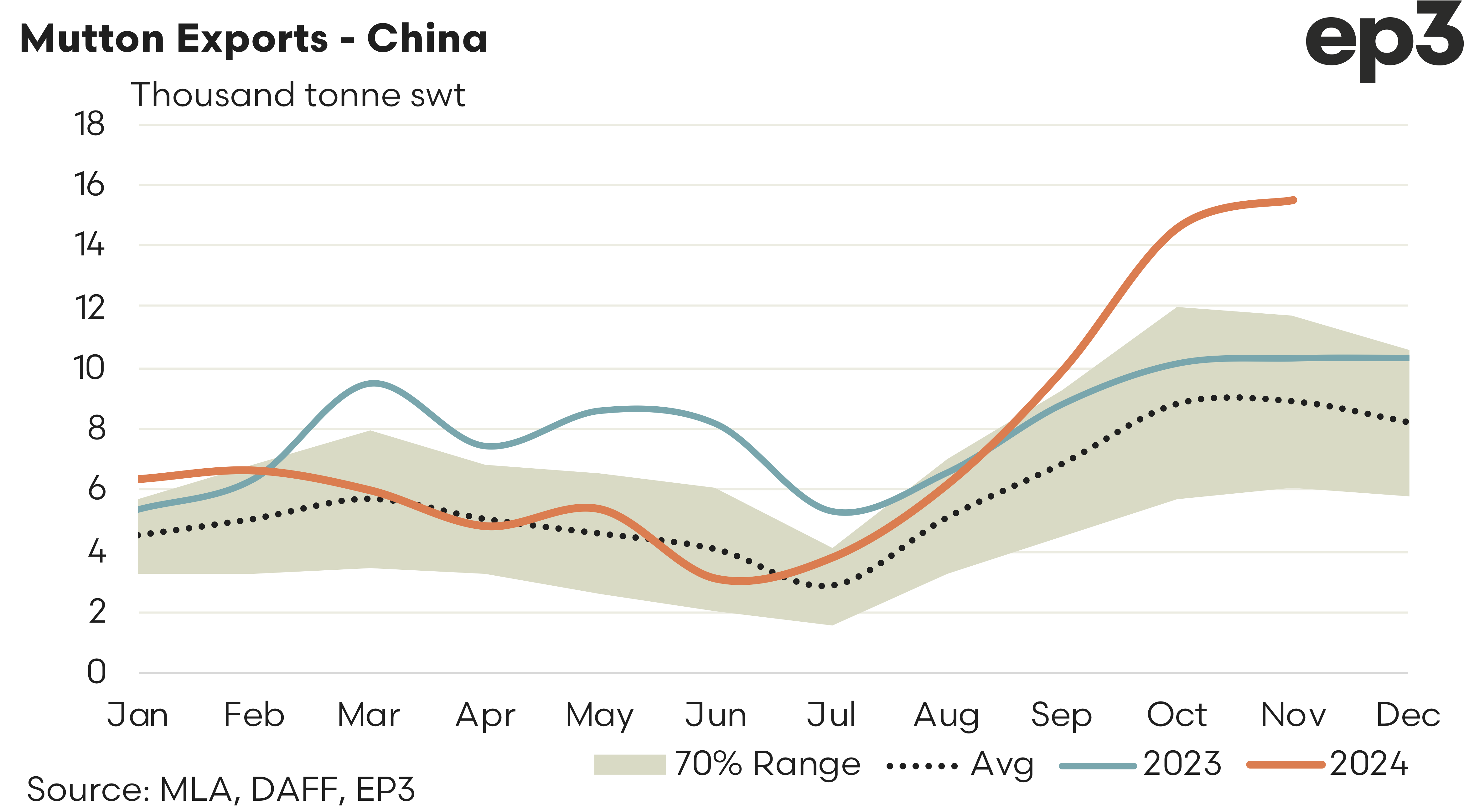 China – November 2024 saw a new record for monthly mutton export volumes from Australia to China with 15,526 tonnes shipped over the month. The last quarter of the year often posts the highest seasonal flows to China fro Aussie mutton exports, so it is not unsurprising to see a record broken at this time in the year. However, the current export levels are exceptionally robust sitting 50% higher than the mutton export flows seen during November 2023 and 75% above the November average volumes, as per the last five years of the trade.