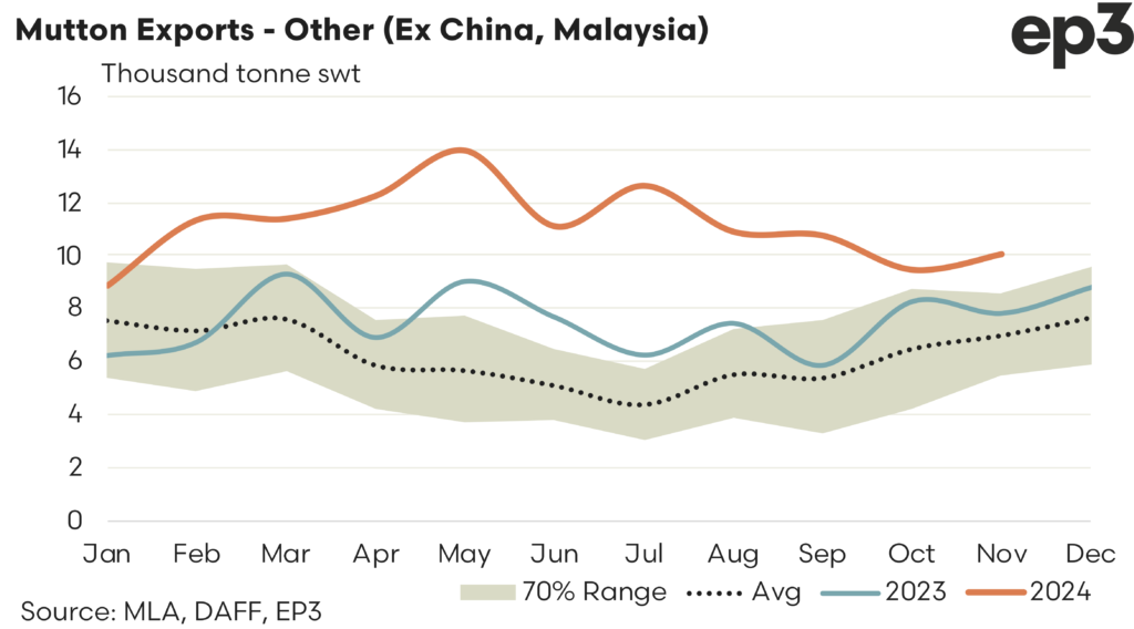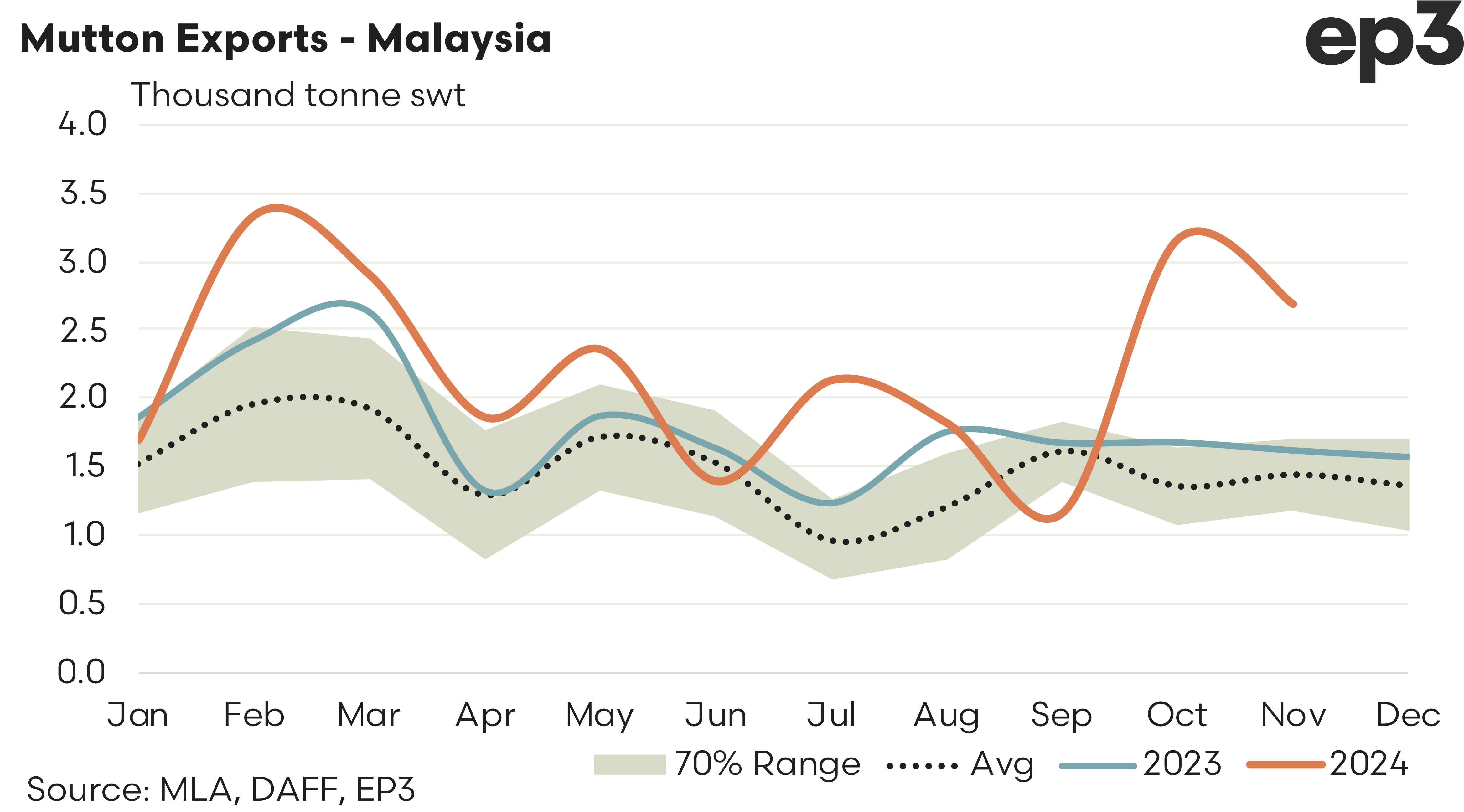 Malaysia – During November the mutton export levels from Australia to Malaysia dipped 15% from the levels exported in October 2024. The October volumes were the second highest monthly flows on record to Malaysia so a 15% decline is still coming down from relatively high trading volumes. There was 2,695 tonnes of Aussie mutton product exported to Malaysia in November 2024, which represents trade levels that are 86% above the five-year average flows for November.