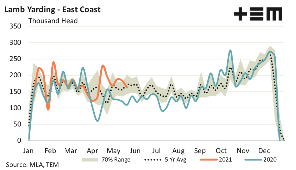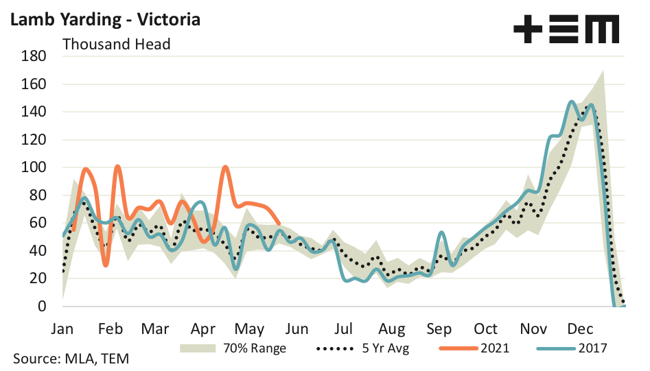 - From their mid-April peak, lamb yarding levels in Victoria are off by 40% but they remain 14% above the five-year average pattern for this week in the year.