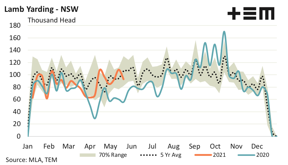 While NSW lamb throughput can often add an extra 40,000 or so head of lamb to the weekly saleyard volumes through October to November it is generally dwarfed by the 100,o00 odd head of lamb that hits Victorian yards. For the week ending 21st May we did see 14% lower NSW lamb yardings from the week prior to record 92,921 head of lamb presented at NSW yards, a figure nearly 13% under the average pattern for this week in the season.