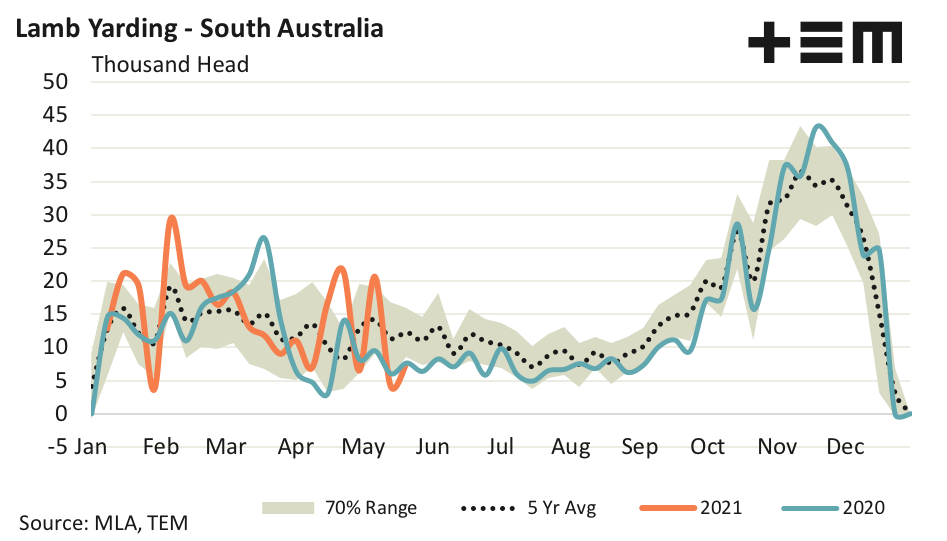 However in the last two weeks SA lamb yarding levels have settled under 10,000 head per week, mirroring the volumes seen this time last year. For the week ending 21st May, SA lamb yarding levels were reported at 7,579 head. This represents saleyard lamb volumes that are 38% under the five-year average seasonal pattern for this week in the year and are levels usually reserved for the depth of winter.
