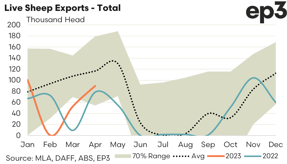 Total live sheep export flows continue to climb as we head toward the middle of the year. April 2023 saw 89,475 head of sheep shipped offshore, up nearly 72% from the levels exported in March. Despite the continued grind higher total live sheep flows remain below the five-year average pattern, with April running 23% under the average seasonal trend.