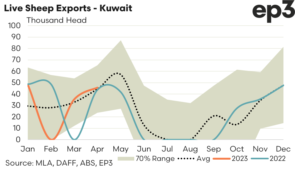 - Kuwait has seen monthly flows for March and April sit marginally above the five-year seasonal average at 35,257 head and 45,546 head, respectively. The average monthly volumes to Kuwait so far over 2023 are nearly 5% under trend. This is despite January, March and April coming in above the average seasonal pattern. Zero flows in February to Kuwait has dragged the monthly average below trend so far this season.
