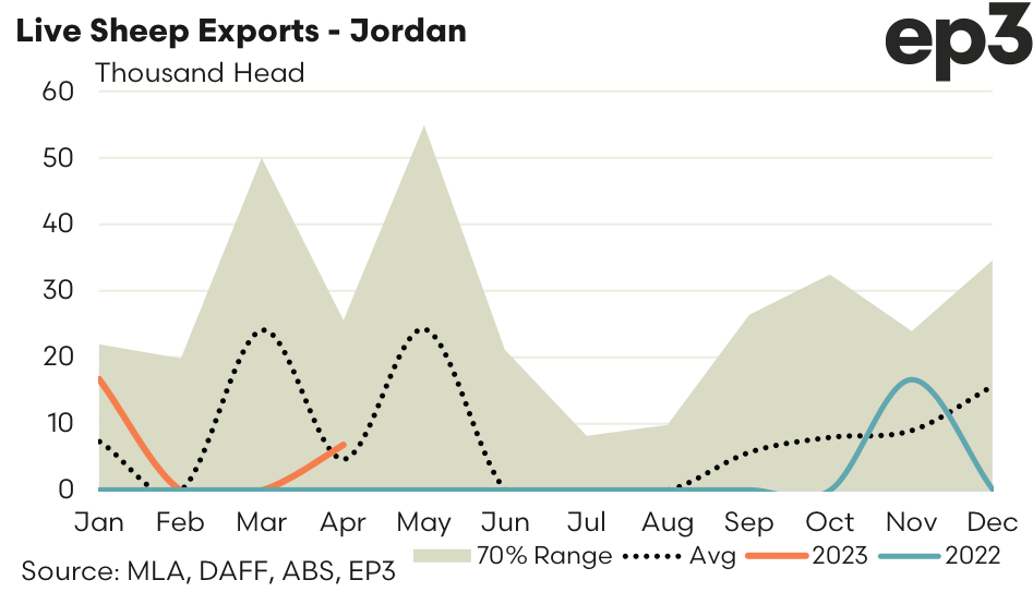 - After scant sheep export flows for much of 2022 Jordan has returned to life with above average export volumes recorded in January and April. There were 6,844 head of Aussie sheep shipped in April 2023 to Jordan, after two months without any trade. Compared to the five year average trend April is running nearly 47% above the seasonal pattern, which has helped propel Jordan back into second top spot for live sheep exports from Australia.