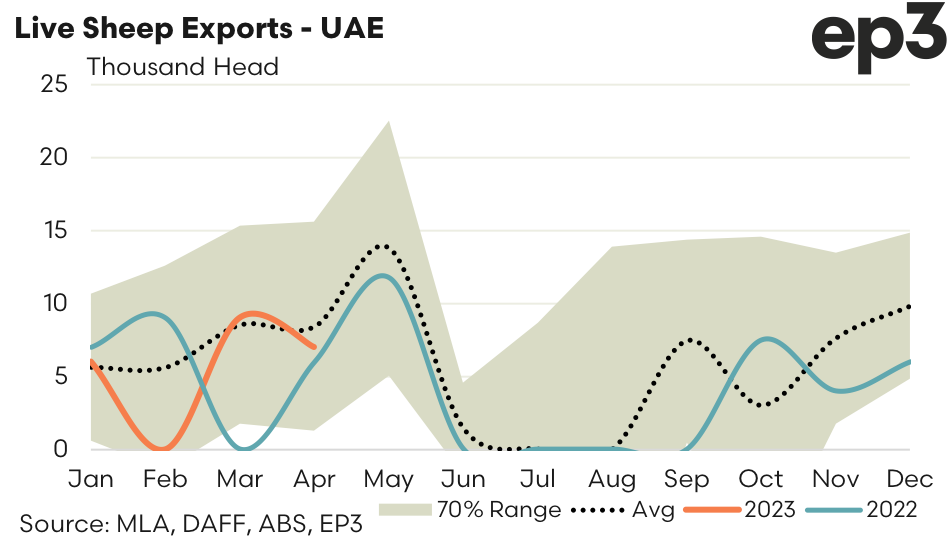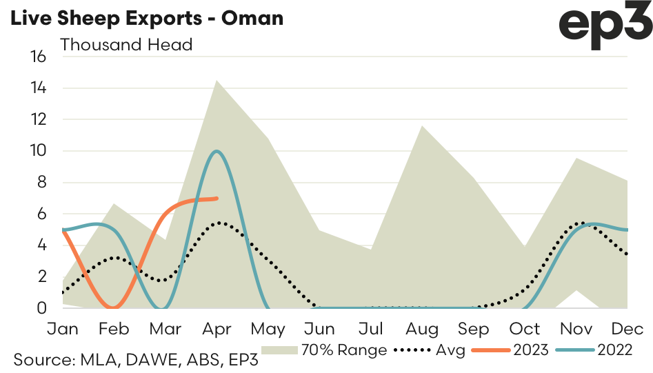 - Apart from February, where the were no flows, Oman has had a strong start to the 2023 season with all other months to April managing above average flows. April saw 7,000 head shipped, which is nearly 30% above the five-year trend for April. Despite the lull in the trade seen in February average monthly shipments to Oman have been running nearly 58% above the average seasonal pattern so far in 2023.
