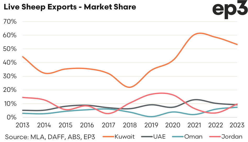 Kuwait remains the key destination for Aussie sheep, taking around 53% of the market share of the trade so far in 2023. Jordan has regained second place in terms of market share after spending 2022 sitting in fourth spot. Jordan accounts for nearly 10% of the flows so far this year, just ahead of the United Arab Emirates on a little over 9% of the trade.