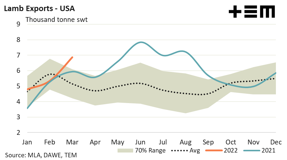 During March Aussie lamb export volumes to the USA lifted by nearly 29% to record 6,866 tonnes swt. Compared to the five-year average for March these levels are running about 33% above the seasonal trend.