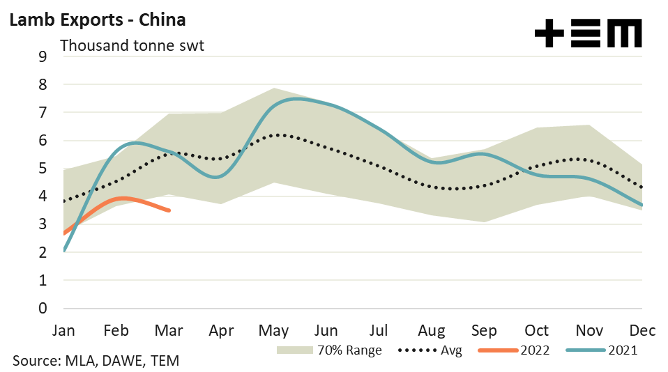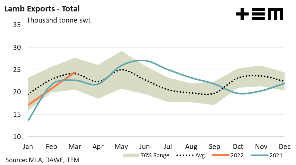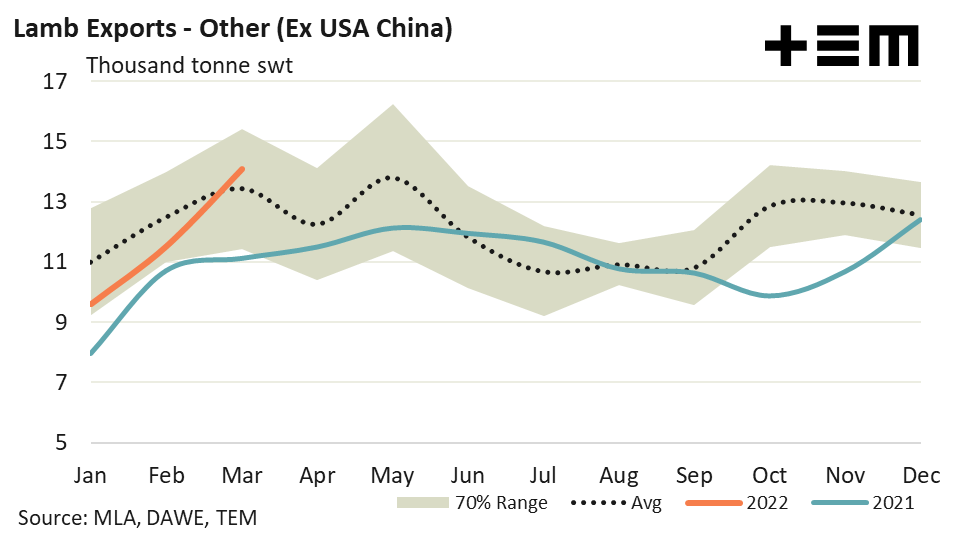 • Lamb exports to all other destinations lifted by 22% on the volumes recorded during February 2022.