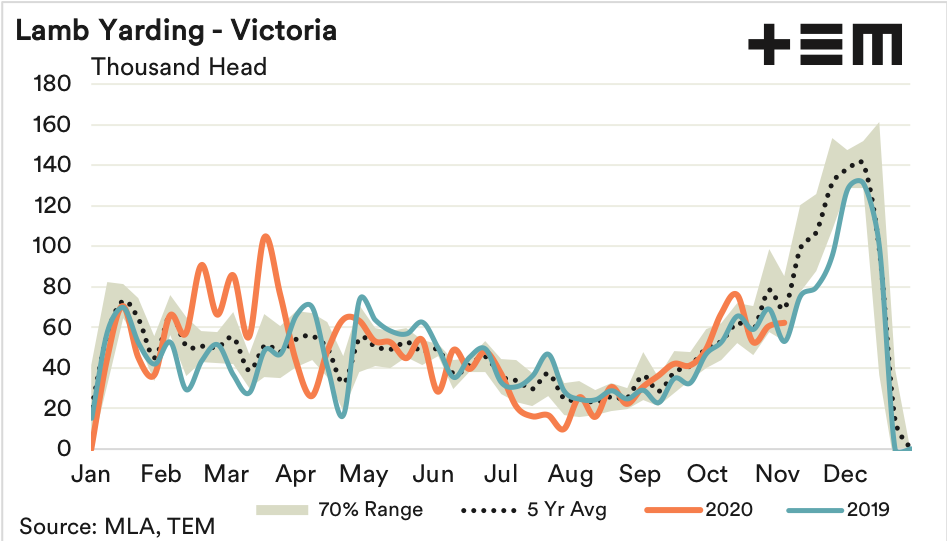 Last week lamb yarding numbers in Victoria remained somewhat subdued running 10% under the average trend for the first week in November at just over 62,000 head.