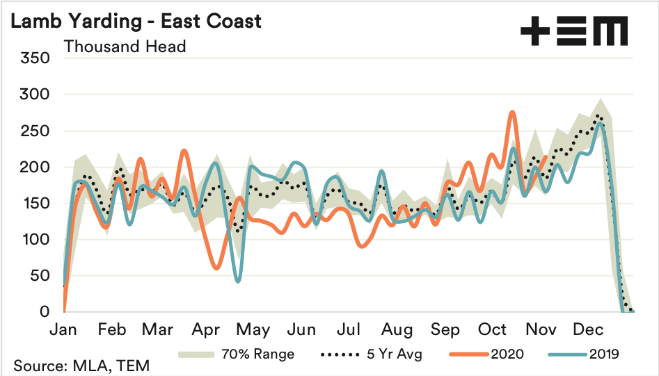 - East Coast lamb yarding levels are currently running 16% ahead of the average seasonal trend for this time in the year, suggesting most producers are being tempted to offload lambs by the strong prices on offer.