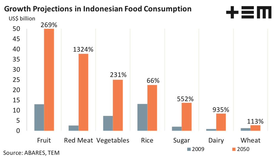 Projections in Indonesian food consumption patterns outlined in a recent Australian Bureau of Agricultural and Resource Economics and Sciences (ABARES) report demonstrate significant levels of growth across key agricultural sectors where Australia holds the capacity to be a dominant supplier.