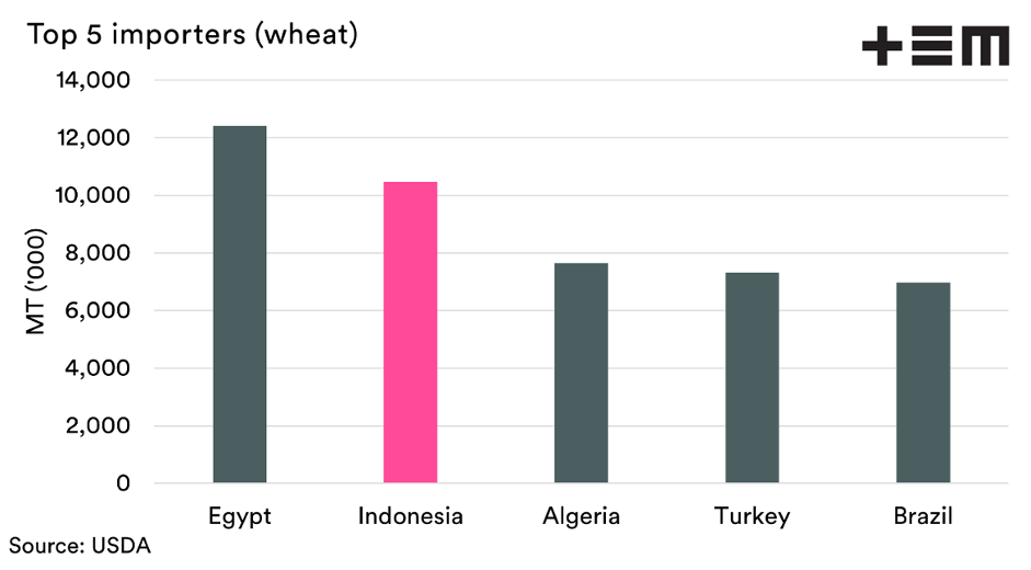 Indonesia is Australia’s largest market for wheat exports and their demand for wheat has been already on the rise. During the last half of the 2000s, Indonesia imported on average 5.6mmt of wheat per annum. During the past five years, this has jumped to 10.5mmt and places them as the second largest importer of wheat behind Egypt.