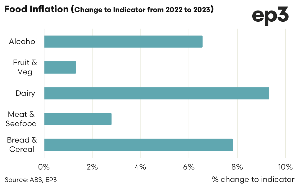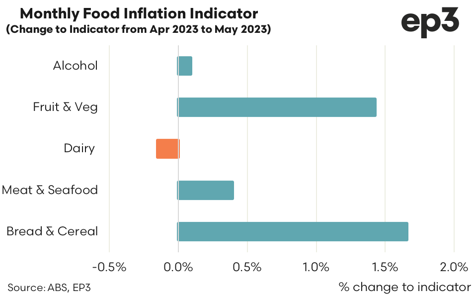 Fruit & Vegetables saw inflationary pressure rebound after showing some deflationary movement from March to April. May 2023 saw the Fruit & Vegetables category CPI up by 1.4%. Meanwhile, Meat & Seafood demonstrated more moderate price increases of just 0.4% over May. Alcohol was almost unchanged, up by just 0.1% during May, I’ll drink to that!