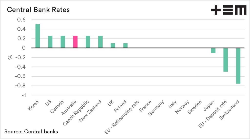 What might surprise many is that even at our low central bank rates, we are at the top of the range of developed economies. What a world to live in when a central bank rate of 0.25% is amongst the highest in the developed world!