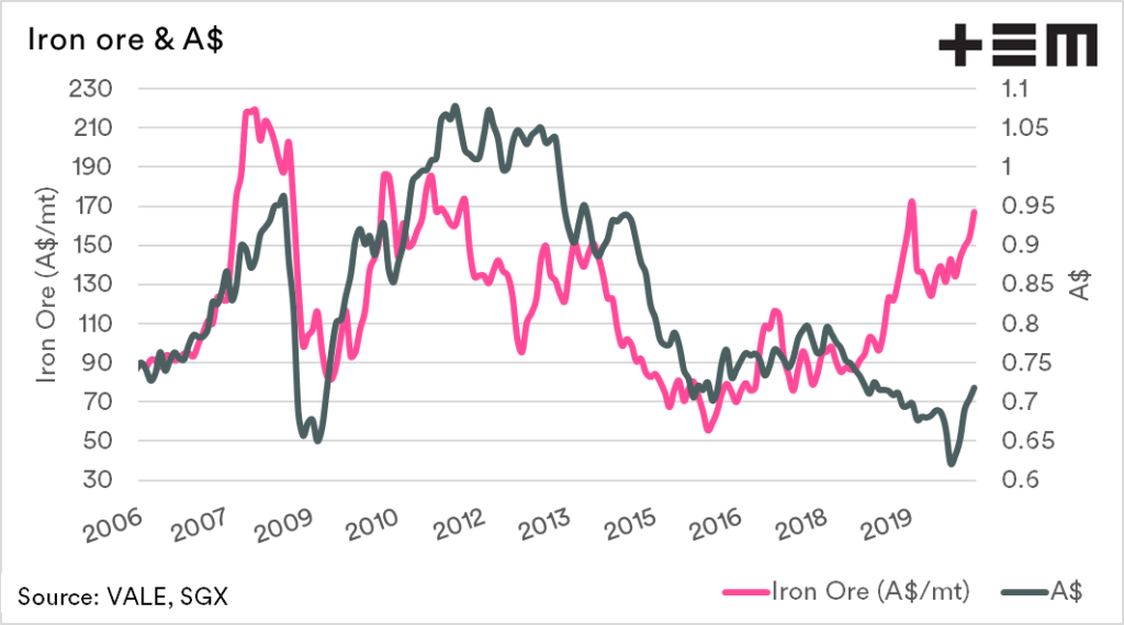 The price of iron ore has increased from A$139mt during January to A$167mt in August. There is a pattern where higher ore prices lead to higher A$ levels, and this is starting to be seen in recent months.