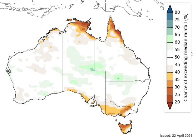 Indeed, the BOM three month outlook for rainfall to July 2021 suggests that the chance of exceeding the median rainfall level is less than 40% for the Top End of the NT, Cape York Peninsula in Queensland, southern parts of SA, and most of Victoria and Tasmania.