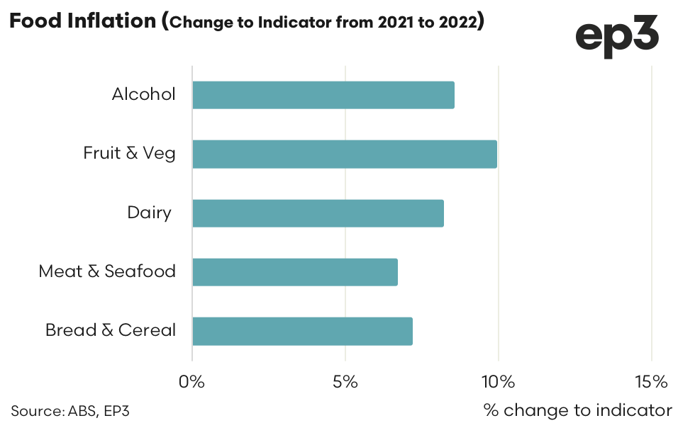 Despite the deflationary move in November on an annual basis alcohol prices are the second most inflationary in 2022 with an 8.5% price gain noted as at November 2022. Dairy product prices also lifted solidly over 2022 with an 8.1% increase over the season, thus far. For the food items reported by the ABS in their monthly update the meat & seafood category showed the weakest price gains on an annual basis at an increase of 6.6%.
