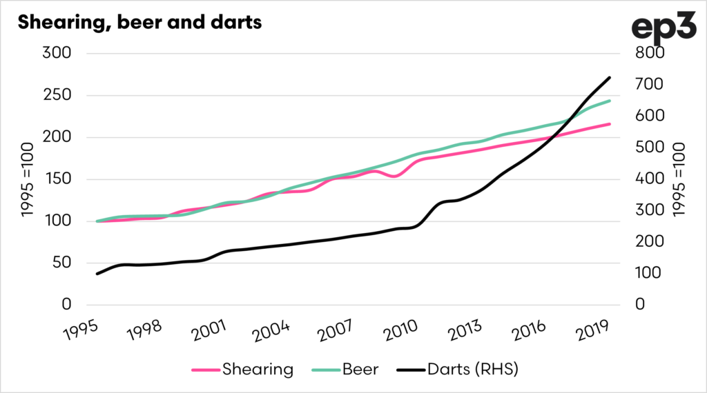 In the past, we have examined the cost of living crisis facing shearers at the request of a subscriber. Namely the cost of shearing a sheep versus the cost of a beer and a packet of darts (see chart below). Shearing rates have kept a similar pattern to beer, but cigarettes have become very expensive.