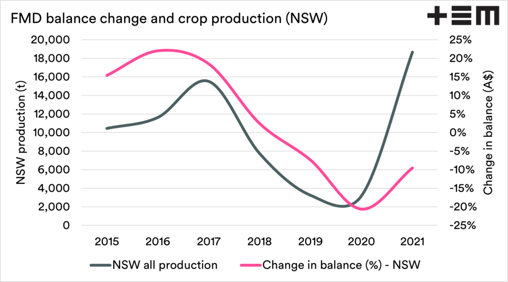 The chart below shows the change in FMD balance between June and June, the peaks between years. This is overlaid against the production of all crops for the season that corresponds best.