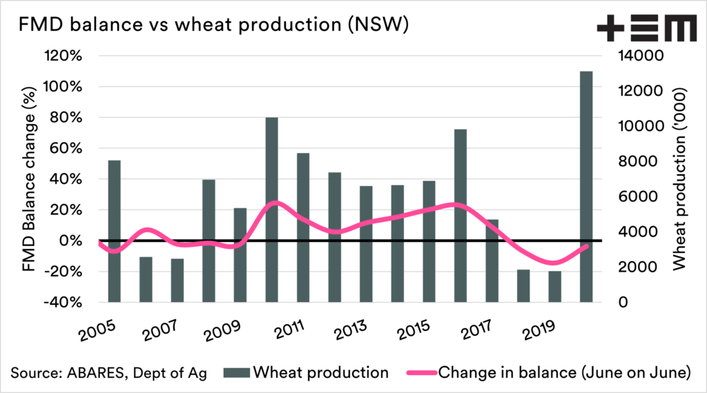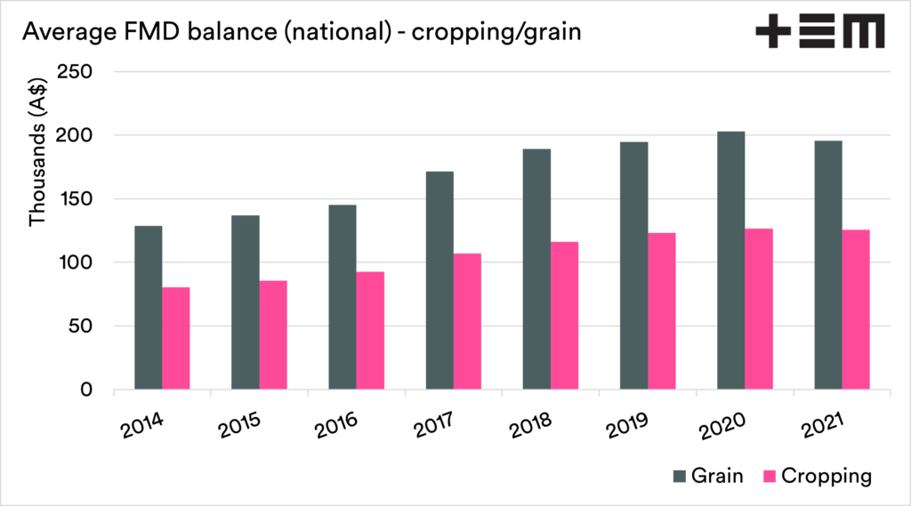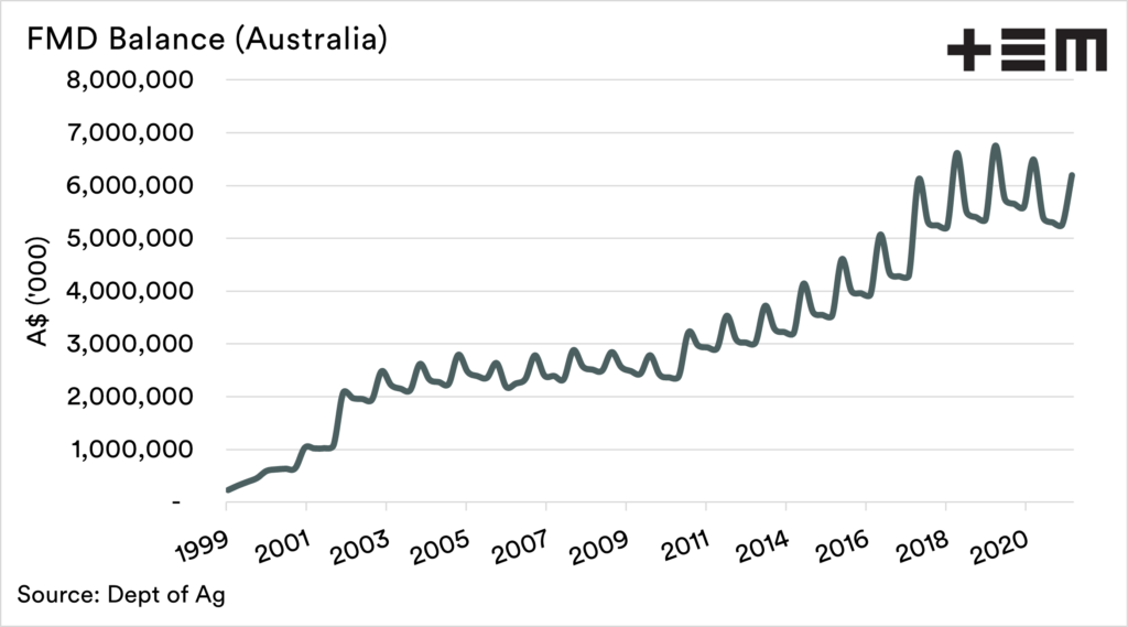 The chart below shows the overall FMD balance at the end of each quarter since 1999. It’s an odd locking chart as it peaks once a year. The peak occurs during the end of the June quarter as farmers funnel money into FMD’s ahead of the new financial year, then farmers reduce their balance in the next quarter.