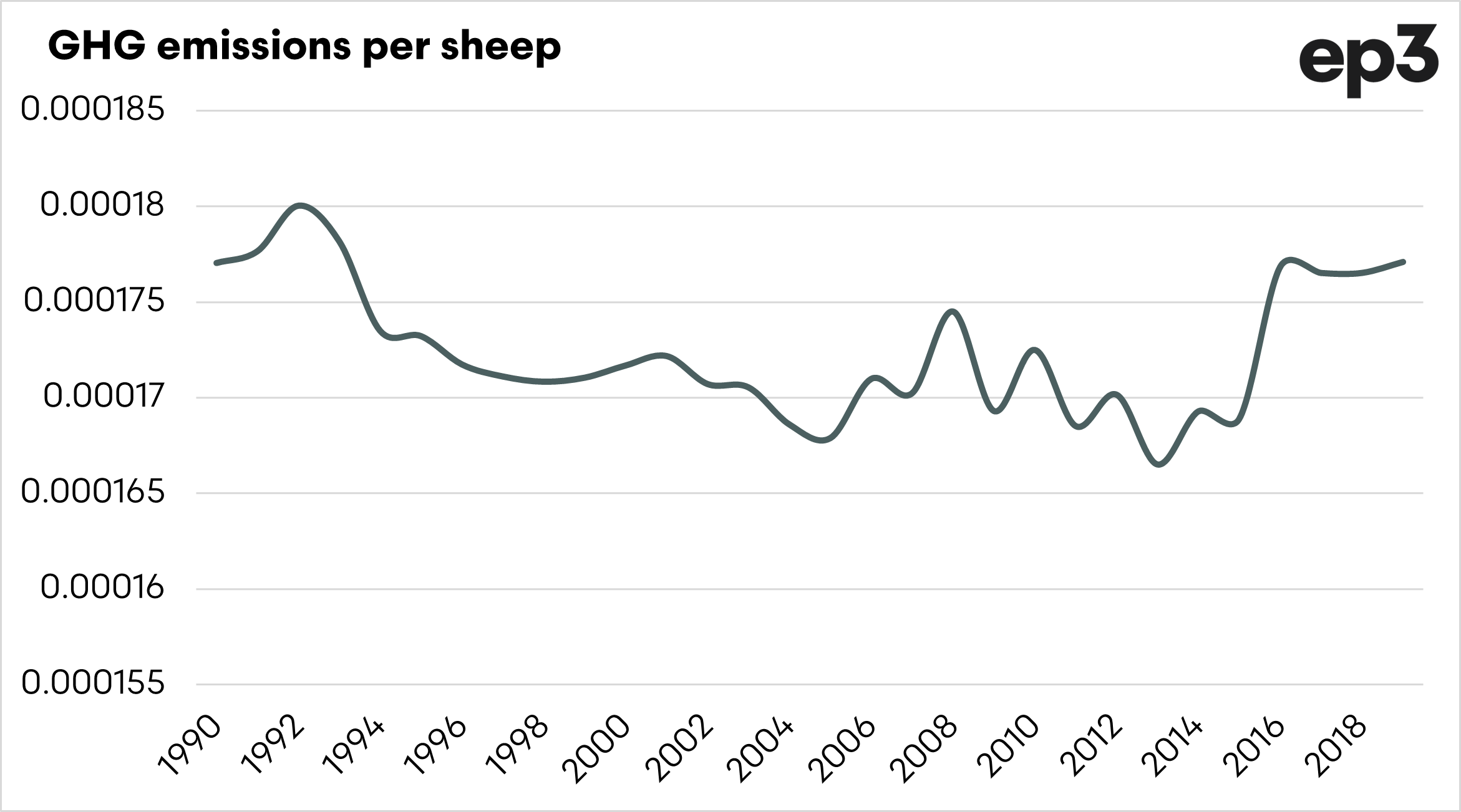 If we delve further, in the second chart, the emissions per sheep is calculated. We can see that the emissions per sheep are at similar levels to the baseline in 1990. This is clearly a rudimentary value, based on the UNFCCC data versus the sheep flock numbers.