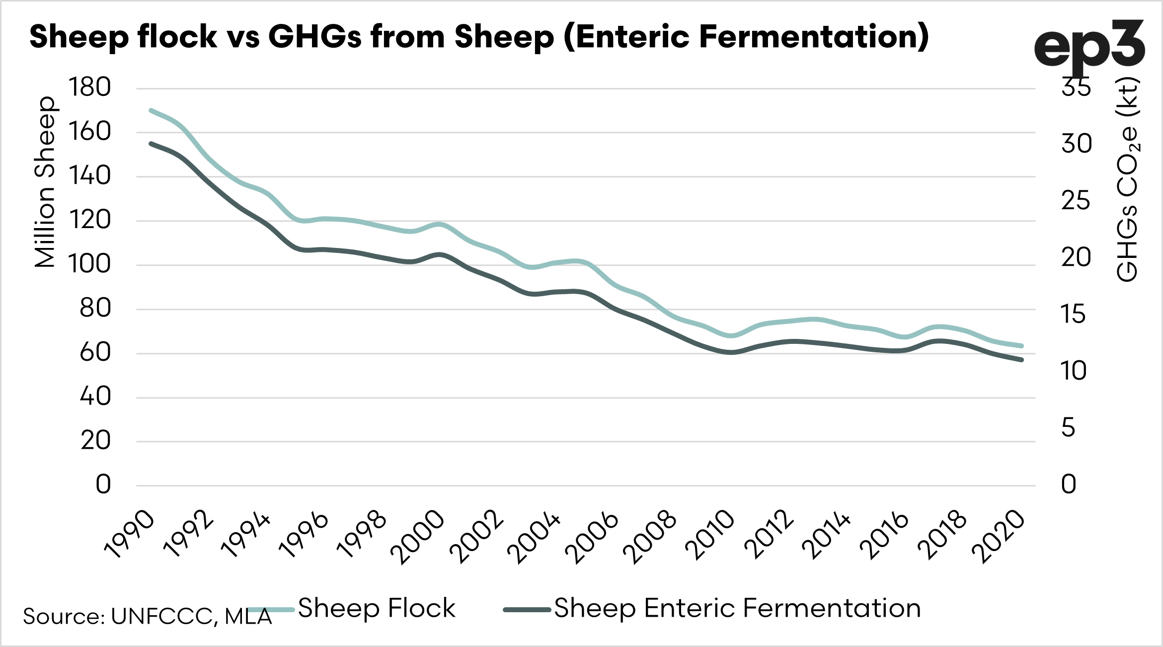 The UNFCCC provides data on the volume of emissions created through sheep enteric fermentation. If we compare these emissions against the total sheep flock, we can see that they are declining, with a correlation of 0.99
