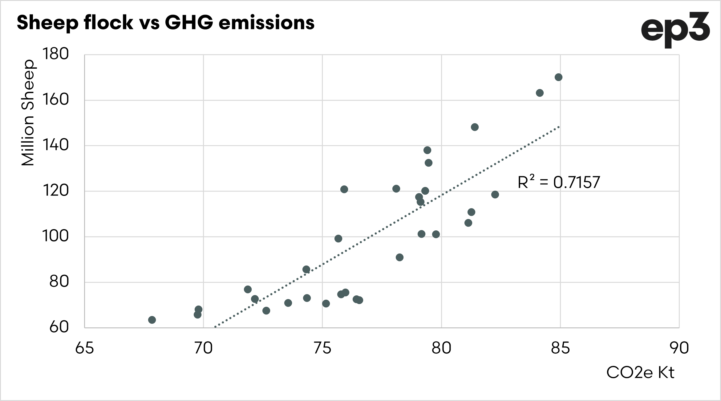 The chart below shows the correlation between the sheep flock and GHG emissions. It is a strong correlation. As the sheep flock declines, so does overall agricultural emissions.
