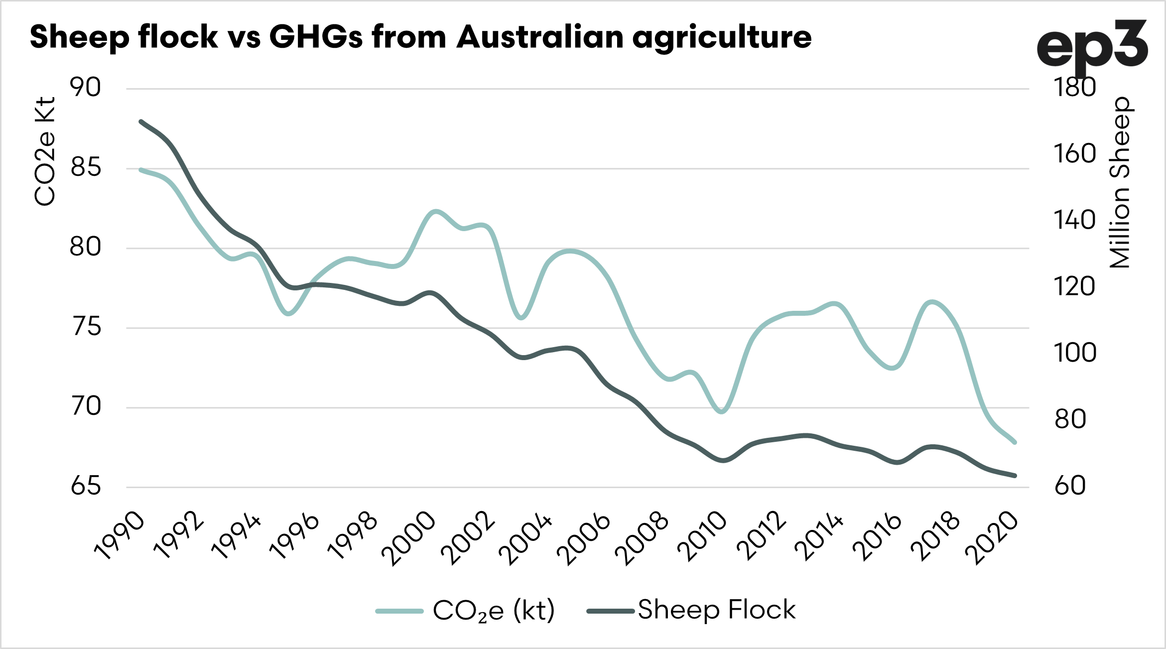 If the data is correct, then Australian agricultural emissions are down on the 1990 baseline, which is, in theory, great. However, it is largely attributable to the decline of the sheep flock.